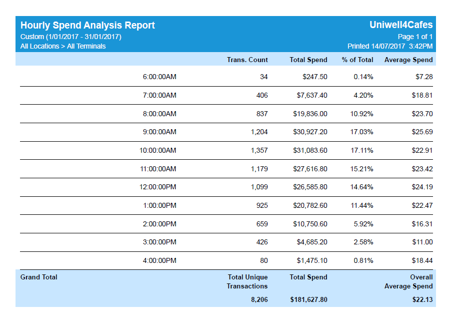 So how is this information useful? Firstly, it helps you to ascertain appropriate staffing levels. You can also view whether there are any specific quiet spots each day during your week, and then tailor your marketing (such as on social media) to increase sales during that specific period.