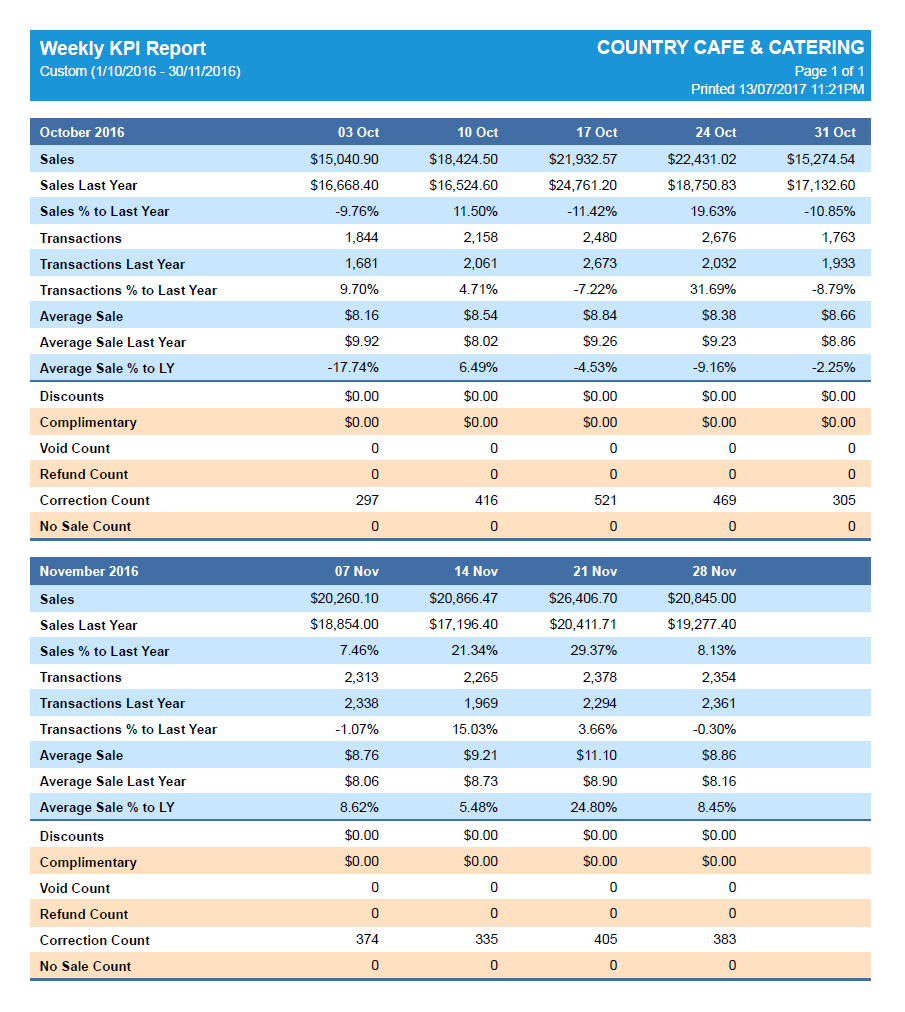 The Weekly KPI report is designed for broader analysis. Best viewed over at least a month, it breaks each week down (from Monday to Sunday) and presents sales totals, transaction counts and average sales that allow for easy performance comparison.